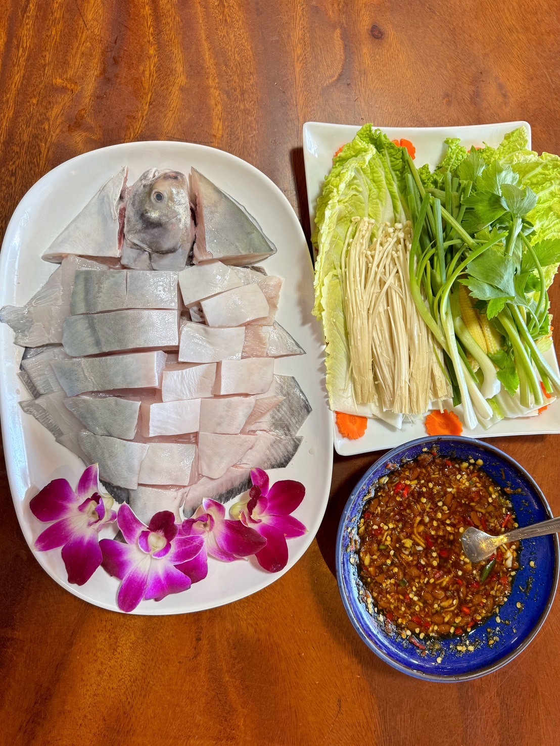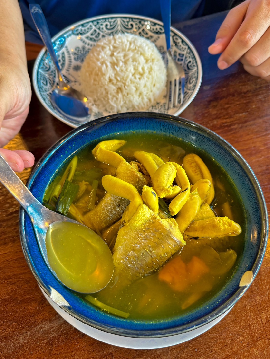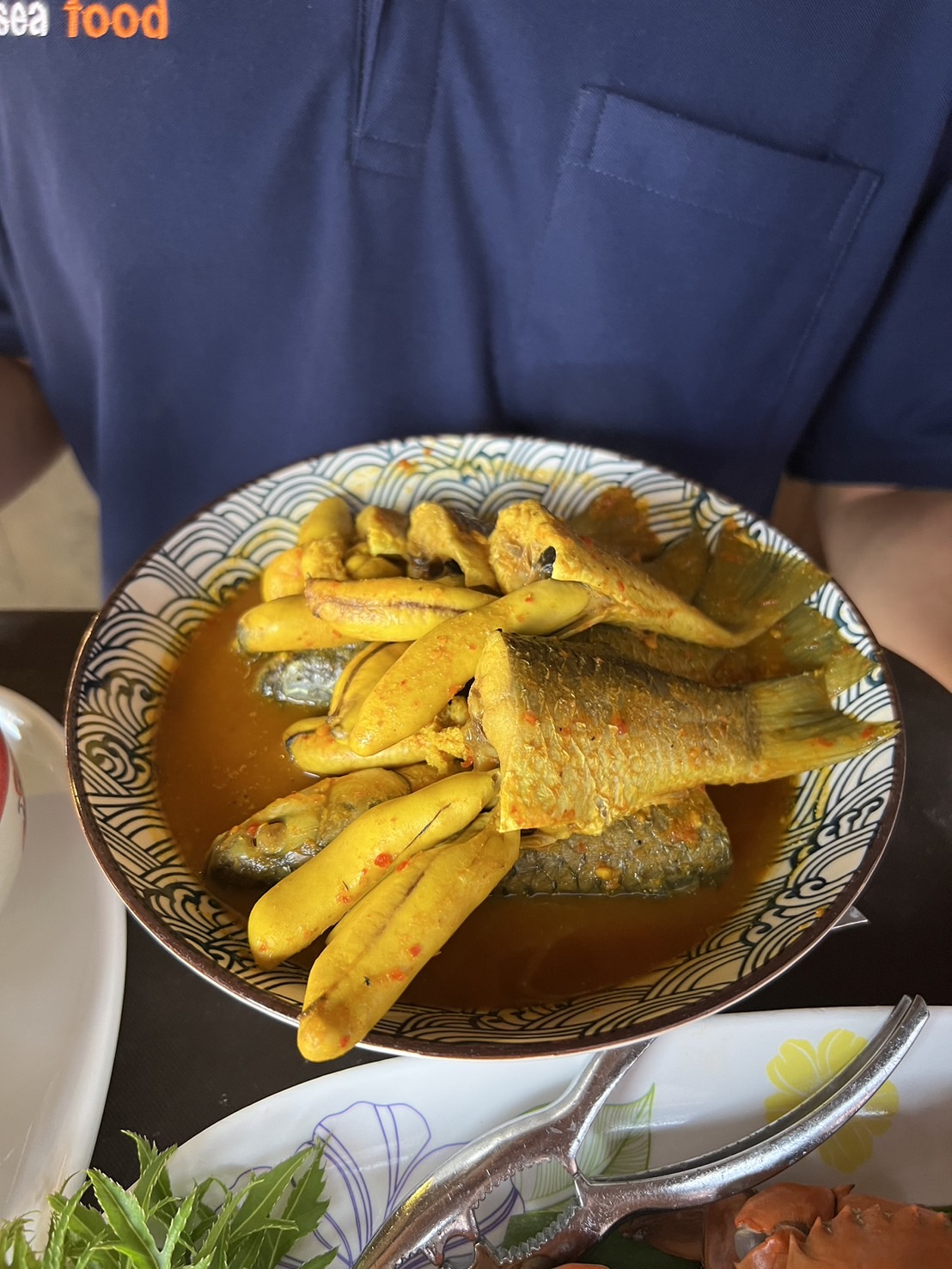 • แกงส้มปลากระบอกไข่ยอดพร้าว